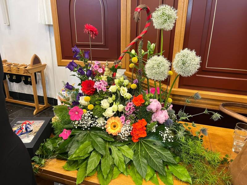 Centraal in het bloemstuk staat een herdersstaf. Dat is een verwijzing dat je onze herder en leraar bent geweest. De klimop en de rode draad waarmee deze staf is omwikkeld symboliseren een teken van Gods trouw en inspiratie door de Heilige Geest.